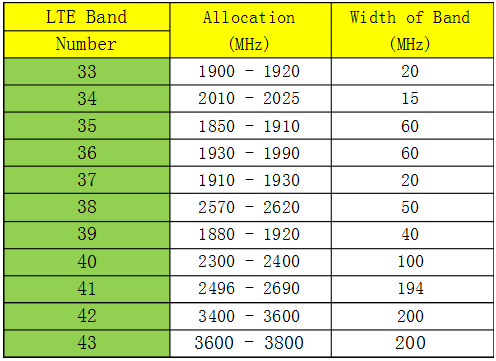 TDD LTE frequency band allocations